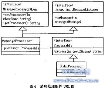 下面將描述創建一個MBean來實現一個數據處理節點。消息組件可以按照MBean來部署。消息處理組件執行功能:從源隊列中獲取消息,對消息執行處理,然后將結果消息放置到目標隊列。圖6顯示了這個組件的UML設計。