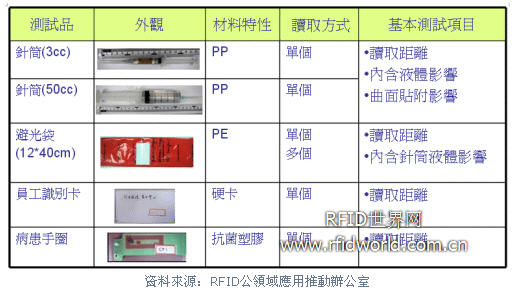 (1)此次驗證主要針對化療用針筒與裝置針筒的紅袋為主,測試多款RFID產品的讀取率、厘清技術疑點,并測試針筒是否因含有液體,而可能干擾讀取效果。因為化療藥物具腐蝕性,驗證過程無法用實際藥物,改以生理食鹽水取代之。