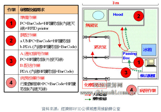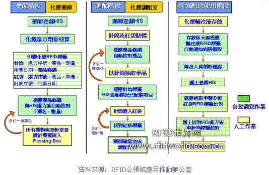 一開始醫療輸注液應用的驗證范圍,涵蓋TPN(全靜脈注射營養劑)與化療針劑的調制作業。而當進一步與負責藥師溝通后,則鎖定化療針劑。因為TPN出廠時已多為調配好的溶液,藥師僅需針對特殊營養配方再加入藥劑,其危害性亦遠不及化療用藥。而化療用藥則具備了高危險性(因其對人體皮膚將產生腐蝕作用),高價,調制過程需要高度專業技術的特性。針對化療藥品從藥劑科庫房辨識核對拿取,藥劑師于化療無菌調配室調劑,通知病房傳送人員領取,最后到護士于病房施打流程,在最重要的核對領用簽收關卡,運用RFID自動擷取標簽資料,進行比對與簽署,并完整紀錄針筒藥品的調劑過程,自動發送警示通知。