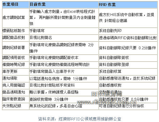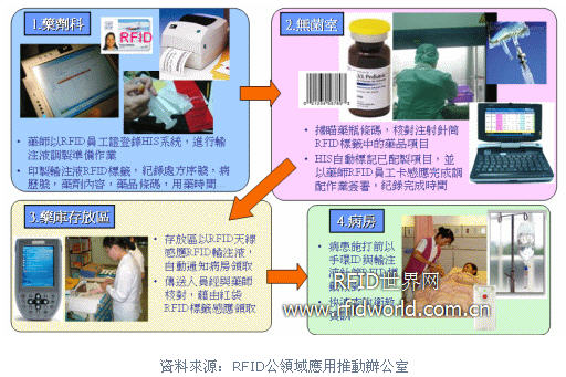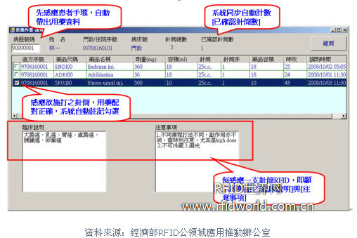 護士可經由讀取RFID標簽,由系統查看藥品作用,施打注意事項,及其他衛教資訊。