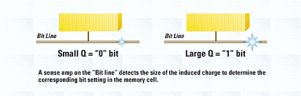 圖5、位在線的感應放大器偵測到感應電荷的大小,并決定于記憶格設定相關的位。