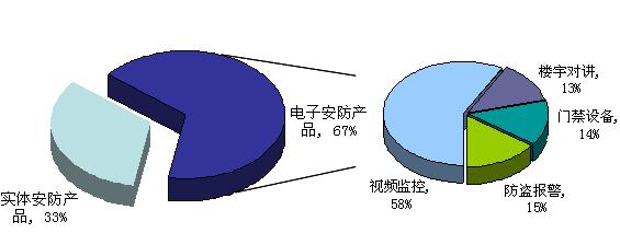 設備制造市場中,實體防護產品產值占總產值的33%,電子安防產品產值占67%。在電子安防產品的產值中,視頻監控產品占58%、樓宇對講產品占13%、門禁控制產品占14%、防盜報警產品占15%。