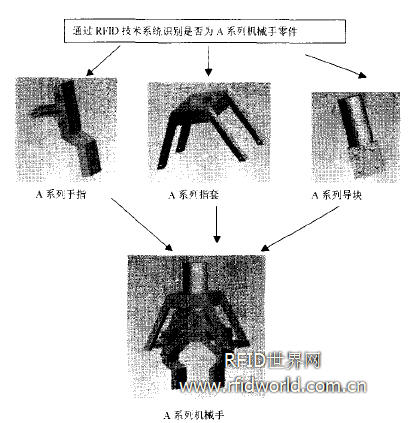 同樣的,在裝配線上的也可以利用RFID技術來管理。例如要裝配一套型號為A 的機械手,如圖2,通過識別RFID標簽上的型號信息來判斷是否是要進行裝配的零件 型號,如果是,就投入下一道工序等待裝配,如果不是,就篩選掉。