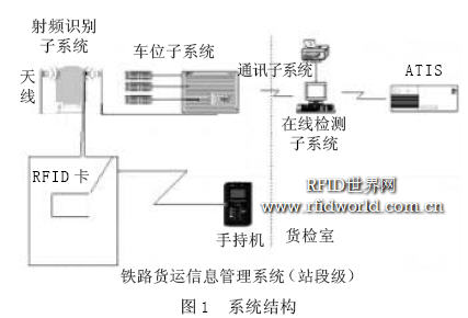 RFID 施封鎖系統由門鎖狀態傳感器、射頻鎖卡標簽、閱讀天線、手持讀寫器(手持機)、車序子系統、通信子系統、車號子系統、計算機軟件系統構成。系統結構如圖1 所示。