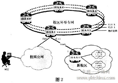 校園“一卡通”管理系統中,校園卡一般采用非接觸式IC卡,同時與磁條相結合,使校園卡既具有校內結算功能,又具有銀行金融服務功能。目前,很多學校都是由幾個校區合并而成,為了保證各校區之間數據傳輸的安全,在原來校園網基礎上,