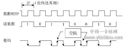 根據我們得到的器件,采用曼碼調制的數據,位數據"1"對應著電平下跳,位數據"0"對應著電平上跳(注意:Telefunken半導體公司提供的資料(Rev.A2,13-Oct-97)正好與此相反,故最好用前自己先測試一遍,切記!)。在一串傳送的數據序列中,兩個相鄰的位數據傳送跳變時間間隔應為1P。若相鄰的位數據極性相同,則在該兩次位數據傳送的電平跳變之間,有一次非數據傳送的、預備性的(電平)"空跳"。