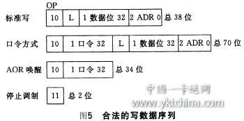 向e5550寫位數據時,有四種合法的數據流,具體如圖5所示。其中,OP為操作類型碼,包含兩位,"10"表示即將進行的是寫操作,"11"為終止IDIC操作碼。多IDIC操作情況下,用這一特性可逐一控制應答器,使待控應答器逐一產生穩定的射頻振蕩。當方式數據區的第28位(usePWD)為"1"時,在寫操作碼"10"之后,即須將32位的口令(password)寫入EEPROM的第7區。位數據流有33位,是按區寫入的。其中的第一位為鎖定位L,L="1"表示該區為只讀區,L="0"表示該區為讀寫區,其余的32位為位數據。ADR為該位數據流的存放數據區,取值范圍為0~7。