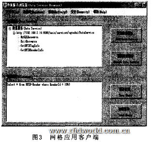 RFID網格數據服務的構建是基于OGSA—DAI,Web Service服務器(AxiS 2.0)以及G1obus Tooikit4.O基礎之上。在成功配置G1obus Toolkit 4.O并將其部署到tomcat后,安裝OGSA—DAI。此時正確輸入命令行,就能夠得到“數據服務瀏覽器”的GUI界面。網絡應用客戶端,如圖3所示。在“查詢語句”中輸入“Se1ect from RFID—Reader where ReaderId=1063”,就可以得到ID為1063的RFID解讀器中存儲的相關農產品質量跟蹤與追溯信息。