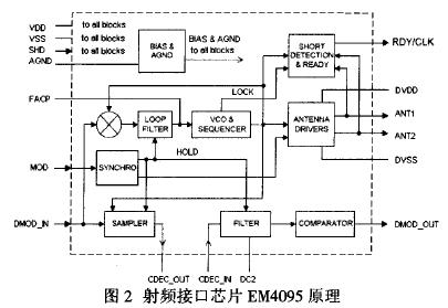 射頻接口電路實現啟動電子標簽和信號解調。系統采用RFID專用無線基站芯片EM4095設計了電子標簽與識讀終端主控模塊之間的射頻接口電路。EM4095功能原理見圖2。