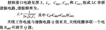 ) 相等,則輸出電壓最大;偏離諧振頻率時,電壓將快速減小。諧振信號經整流濾波后作為片工作電源,當該電壓值達到EM4100的要求時,芯片啟動工作。該諧振電路的輸出電壓值取決于Q值、交變磁場強度及頻率。顯然,電子標簽與識讀終端之間的距離直接影響該電壓值。