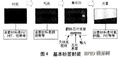 每個被RFID系統標識的物品都對應于一個標簽。對應十不同的應用和環境,標簽制造的方法和封裝形式都不同。藎本的組合步驟如圖4所示,前先是將不同導電材料(鋁、銅)做成的天線沉淀到一個慕底上,然后運用繞線或者翻片等技術將標簽芯片連接到天線上,最后用PVC薄片、松香或者膠紙選擇性地做成保護層以支持其在特定環境物理中(摩擦、擠壓和腐蝕等)的應用。