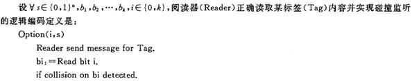 RFID系統在讀取標簽時,若可讀取的范圍內存在多個標簽,就會產生讀取“碰撞”現象。如果沒有防碰撞功能,RFID系統只能讀寫一個標簽.即使具有防碰撞功能的RFID系統,實際上并非同時讀取所有標簽的內容,而是采用次數批量,將響應的時機離散化.如設置讀取次數批量為“0,1”,閱讀器在不同時刻按照“0,1”逐位響應,閱讀器選取“0”或“1”與相應位進行比對,如果不同,閱讀器會發出命令使該標簽失活(deactivate),直到讀取到相應標簽為止.