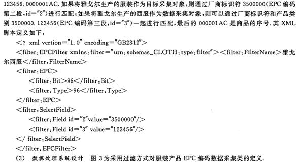 (2) XML對項目篩選在設定采集項目后,通過設定如圖1所示的后3個數據段的目標值對采用RFID編碼的數據進行內容篩選.例如,假設雅戈爾生產的男式西服的96位EPC編碼為10.3500000.