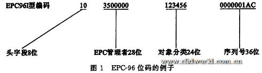 產品的EPC碼主要由4個部分組成.Header(頭字段)表示版本號,它決定整個EPC碼的位數;EPC Manager(EPC管理者)表示產品的廠商信息;Object Class(對象分類)表示物體類別Serial Number(序列號)表示惟一一件物品.EPC碼有64位,96位和256位.顯而易見,位數越多標識的產品數也越多,但是RFID標簽的成本也就越高.圖1是一個96位的EPC碼的例子,其中每一個數字是16進制數,表示4位.從圖1中可以得出,使用此EPC碼來標識物品對于每一個生產廠商的同一類產品來說可以采用的產品序列號是0~2 36 一1,即標識2 36個同一類產品,應該說在大部分情況下是足夠的.