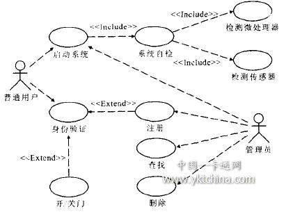 從圖中我們可以明確地了解到系統的功能需求.該系統主要有兩類用戶:普通用戶和管理員.“啟動系統”用例表明系統初始化時要進行傳感器和微處理器等的自檢.進入正常工作狀態以后,普通用戶可以通過“身份驗證”用例進行指紋驗證.如果是未注冊用戶則在獲得合法II)的前提條件下,通過“注冊”用例注冊自己的相關信息.系統提供的“開/關門”用例則主要是根據指紋匹配結果,通過信號線將控制信號傳輸給門的驅動電動機以此來控制門的開關.管理員主要負責系統維護,可以使用 “注冊”、“查找”和“刪除”等用例進行信息管理操作.由于在該階段我們對系統還沒有充分理解,同時為了控制用例的數目,在這里我們只是給出了系統的總體用例模型,在隨后的詳細設計階段我們可以對這些用例進行進一步的細化以精化系統的需求.