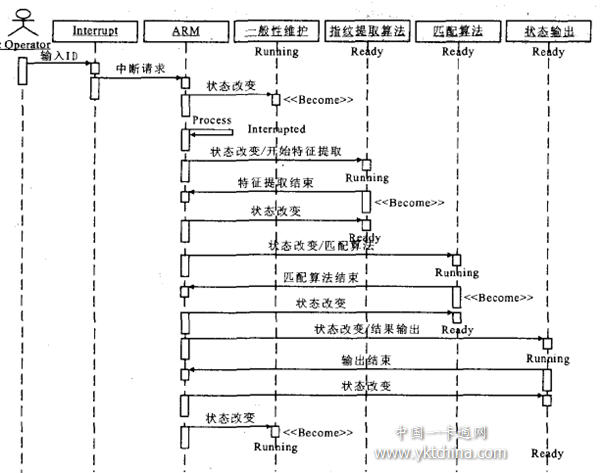 詳細設計階段需要對系統需求中的每個用例進行詳細的分析,并以一種通用的表示來文檔化,以便使開發人員更清晰得了解每個用例的具體實現過程[5].本文以指紋驗證用例為實例,對該用例進行更進一步的詳細分析,它包含了指紋采集、預處理、圖像增強、細化、二值化處理、特征碼提取、比對、結果輸出等過程,這些過程都可以通過文檔清晰地表示.我們在描述系統用例時,是從用戶角度出發的,沒有涉及系統內部.通過分析得到滿足系統需求的類之后,便可根據用例驅動的思想,通過類之間的交互來實現用例.嵌入式系統一般都要與硬件設備如傳感器等進行交互,同時還有很強的時間和內存空間的約束.交互圖就是用來描述對象間的動態交互行為的,它一步步地顯示了使用案例的流程.在UML中定義了兩種交互框圖:順序圖和合作圖.這兩種框圖顯示同一信息,但組織方式不同.順序圖按時間排序,依次顯示對象間進行的操作;合作圖則以數據流為中心,顯示各個對象間的數據交換情況.由于順序圖能更好地說明對象間的交互順序,有利于我們理解系統,所以本文以“指紋 驗證”用例的順序圖(見圖3)為例來描述對象之間的交互過程.其它用例都可以采用此種方法來詳細說明,以便我們更清晰地了解系統每個功能(用例)的具體實現過程.