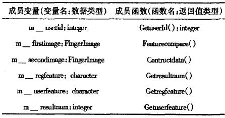 UML規范按照類職責不同將系統設計類分為邊界類、實體類和控制類.其中實體類是系統運行的數據基礎類,也是類設計的核心部分.按照RUP的思想,采用名詞分析法對系統需求進行分析,便可以得到大部分的實體類.對于指紋門禁系統而言,指紋信息數據是系統的核心數據,同時,一些相關的管理信息也是實體類的組成部分,主要有用戶信息、系統13志等等.在這里我們只對系統中兩個主要類進行分析,如下表格1,2所示.