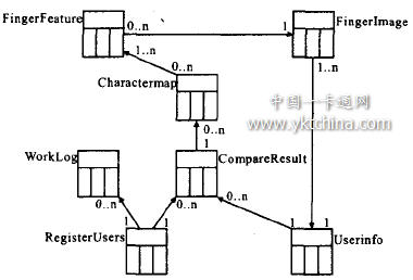 完成實體類的分析與設計之后,可建立其數據庫模型.在本系統中采用Pc機與嵌入式處理器之間的通信來管理相應的數據,因此PC機上數據管理系統的數據庫模型設計如下圖4所示.數據庫表組成包括注冊用戶管理、被鑒定人信息、指紋特征數據和日志管理,數據庫中表結構字段的描述與上文實體類成員變量的結構是相對應的.例如:注冊用戶信息由RegisterUsers表組織,設置的字段有:用戶ID、姓名、用戶級別等;指紋圖像數據表Fin-gerimage設置的字段有:圖像名稱、圖像保存路徑、