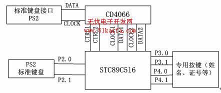 智能采集器的主控MCU為STC89C516RD+[1],該單片機是宏晶科技公司推出的新一代超強抗干擾、高速、低功耗的MCU,其指令代碼完全兼容傳統8051單片機,其晶振為11.0592MHz,串行接口電平轉換芯片為ADM202,模擬開關CD4066實現了專用鍵盤與標準鍵盤的分時復用,電源直接從主機的PS/2口供電,蜂鳴器和指示燈由CPU控制。