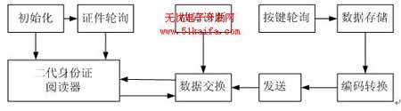 系統通過RS-232通信接口發送命令請求到第二代身份證閱讀器,讀出證件信息;經過驗證后,保存到智能采集器中;再等待系統定義的熱鍵按下,一旦有熱鍵按下,智能采集器將相應的信息取出;處理之后發送到PC機的PS/2鍵盤接口,在光標閃爍處顯示相應信息。