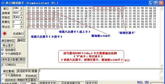以下是(HG系列)非接觸智能卡RFID讀寫器/模塊產品對ISO14443 Type A、ISO14443 Type B、ISO15693 (包括Tag-it等)、SONY Felica(八達通/ 深圳通卡等)、I-CODE電子標簽、中國第二代身份證卡等所進行的閱讀操作而得到的RS232數據輸出實例。