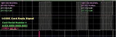 如圖是ISO 15693卡片VICC向(HG系列)最新非接觸智能卡RFID讀寫器/模塊VCD回傳數據信號“01001”的信號機構,由高速運行的微處理器MCU實際檢測得到并處理。