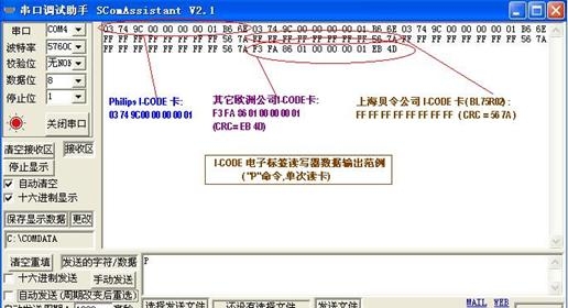 注意,以上顯示的數據中是I-CODE電子標簽/卡片的基本信息(電子標簽/卡片序列號碼UID),電子標簽卡片的其他一些特征數據,已經被過濾,不再回送給上位PC計算機或后臺數據控制器。對于卡片的其它存儲器區域的讀寫操作等另見說明。