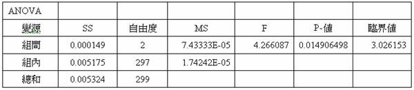 將這些實驗得到的樣本做卷標粘貼位置差異性檢定(α=0.05),由表2檢定出此三種卷標貼的方式有顯著差(P-value<0.05),并且由變異數可知第一組卷標粘貼方式較佳。