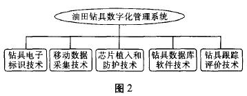 按照上述設計理念,油田鉆具數字化管理系統核心技術構成如圖2,其核心技術包括:鉆具電子標識技術、移動數據采集技術、芯片植人和防護技術、鉆具數據庫軟件技術、鉆具跟蹤評價技術。