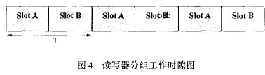 讓這兩組讀寫器分時工作,如圖4所示,假設工作周期是T ,把T分為兩個slot,兩組讀寫器分別工作在slot A和slot B。