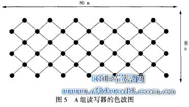 因為兩組讀寫器有著相同的拓撲,讀寫器數目也相等,所以在接下去的討論中,只需對其中任意的一組進行DCS色波算法的仿真,來觀察其性能。以 A組讀寫器為例,圖5是A組讀寫器的色波圖。