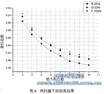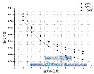 仿真的場景是一個大倉庫,里面整齊的排放著一列列貨架,倉庫的長寬為80m×40m,其中總共布置了78個讀寫器,每個讀寫器的讀寫半徑是4m,間隔是6m。所有讀寫器的總體讀寫范圍覆蓋了整個倉庫平面。仿真時隨機產生各節點的起始顏色號, 仿真過程中有4個參數:最大顏色數,傳輸概率,仿真周期和讀寫器掃描方式。最大顏色數范圍從3到l0,傳輸概率是指讀寫器和周圍的標簽通信的概率, 選取這樣的幾組數值:25%,50%,75%,仿真周期是 一個常數,表示仿真過程中讀寫器網絡的掃描總次數,讀寫器掃描方式共有兩種,分別為行掃描和列掃描。這樣仿真總共有8×3×2=48組。為了盡量減少不同的起始值對仿真結果的影響,仿真周期選取盡量大,本文把他選為100,000。仿真程序用C++編寫,程序運行的環境是Linux 2.6.11 i386 512M內存。仿真運行完成后觀察總的節點成功傳輸次數和總的節點失敗重傳次數,計算出重傳指數,重傳指數的定義如下: