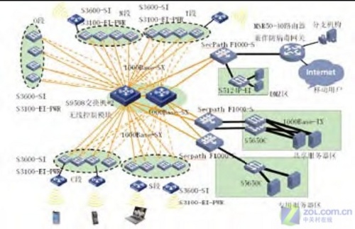 此外,針對網絡的高可靠性要求,H3C還提供了多層次的保障。該方案所采用的S9500無線控制器插卡在繼承了S9500萬兆核心交換機的所有高可靠性特性的基礎上,還另外增加了網絡可靠性設計:每個AP同時和兩個無線控制器建立管理隧道,同時注冊到兩個無線控制器上,一旦AP和主用控制器的通信中斷,則會立即注冊到備用控制器上。在實際應用中,通過命令行設置兩臺S9500交換機上的無線控制器插卡工作在負載分擔狀態,一旦其中一個插卡出現故障,則另外一個插卡立即接手管理所有AP的工作。