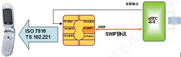 利用SIM卡上現在沒有被使用的C6管腳進行SWP的通訊。用戶卡通過沒有被使用的C6管腳與近場通信芯片相連,以保證近場通信芯片與用戶卡之間進行SWP的通訊,以支持非接觸交易,同時也必須能夠兼容ISO7816接口保證卡原有的移動通訊業務的正常使用(見圖1)。