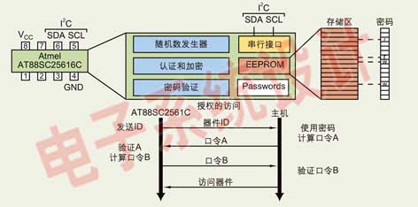 使用安全存儲產品是在具有I2C接口的任何微控制器上增加基本安全支持的一種簡單方法,比如使用Atmel公司的AT88SC25616C加密存儲器(圖2)。系統自身具有完備的安全要素,認證全部在芯片內部完成。