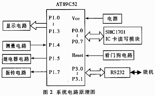 非接觸式IC卡預收費電度表的硬件電路結構圖如圖2所示。圖中主控單元采用AT89C52單片機,其內有8K字節的快速擦寫存儲器(FLASH),無需外接程序存儲器(EPROM)。外接電路主要包括:四位LED顯示電路、電表表盤檢測電路、控制供電的繼電器電路、振鈴控制電路、RS232串行通訊電路、看門狗復位電路、電源控制電路以及控制非接觸式IC卡的SHC1701讀寫模塊。