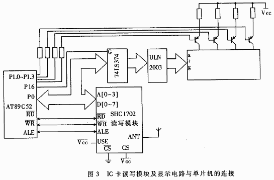 SHC1701 RF模塊是IC卡讀寫器的核心單元,它由SHC1501專用電路和RF電路等組成,覆蓋了所有對非接觸式IC卡SHC1101的訪問操作。IC卡讀寫模塊及顯示電路與單片機的接口如圖3所示。圖中采用4位共陽極的動態數碼顯示管,顯示字符由單片機P0口送至鎖存器74LS374鎖存,再經顯示驅動芯片ULN2003驅動數據管顯示,P1.0~P1.3分別控制每一位的動態顯示。顯示電路用顯示可供使用的電度數。當讀卡發生錯誤時,將顯示錯誤信息。在供電部門存款時,將顯示存入電卡中的電度數。