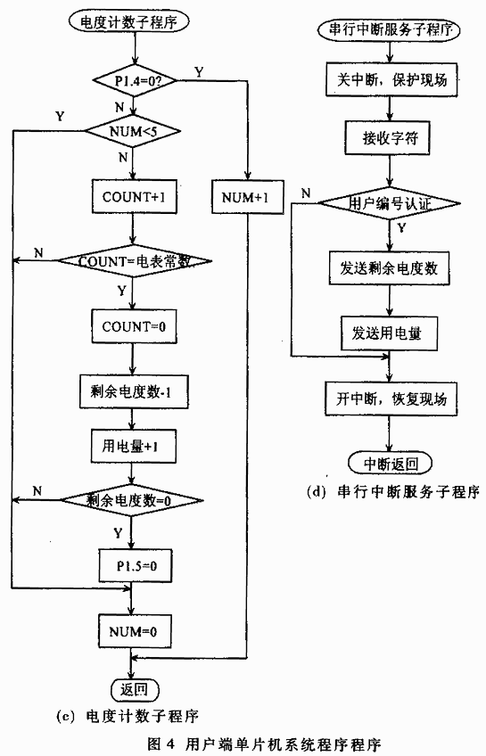 單片機系統程序由主監控程序、IC卡處理子程序、電度計數子程序、串行中斷服務子程序等組成,其框圖分別見圖4(a)、(b)、(c)、(d)。