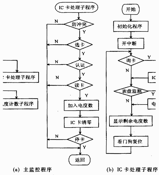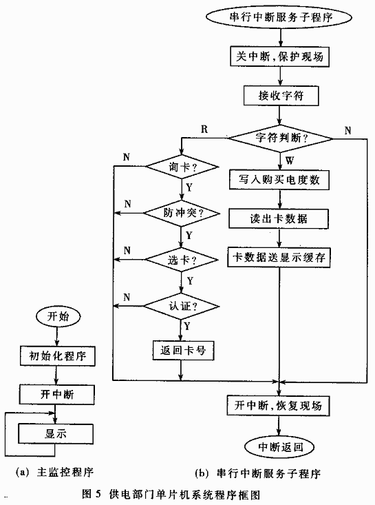 (1)用戶持IC卡到供電部門交款購電時,供電部門把用戶的IC卡放在與PC機相連的讀寫器上,由寫卡程序在IC卡上寫入與用戶交款數相符的一定電度數。