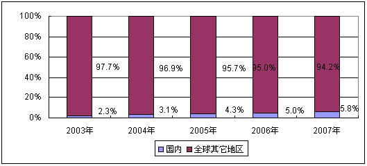 圖3 2003-2007年中國集成電路設計業在全球中所占份額增長情況