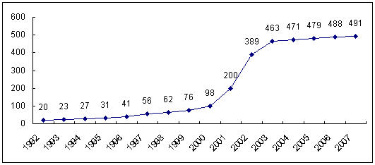 2000年之后,國內IC設計單位數量出現爆發式增長,但2003年之后,國內IC設計單位數量增加速度迅速放緩。賽迪顧問數據顯示,2007年國內集成電路設計單位數量為491家,與2006年基本持平。