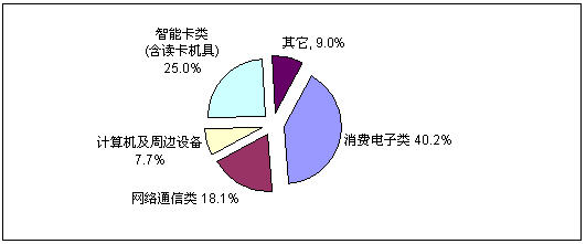 目前,中國集成電路設計產品涉及消費電子、通信、計算機、工業控制、電子儀器等眾多應用領域。由于目前智能卡類(含讀卡機具)的芯片設計在設計業中占有很大一部分比重,因此將智能卡領域予以單列。從2007年國內IC設計行業這些應用領域的表現來看,消費電子、智能卡與讀卡機具仍是目前國內IC設計業最大的兩個產品應用門類。但這兩大領域2007年的銷售收入增幅卻大大減緩,特別是受第二代身份證換發基本完成的影響,2007年智能卡及讀卡機具領域的銷售收入增幅只有3.9%。相對而言,網絡通信領域的IC設計收入在2007年大幅增長了40.5%,成為當年國內IC設計行業的最大亮點。