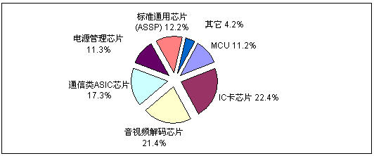 目前中國集成電路設計業產品結構上,仍以IC卡芯片和音視頻解碼芯片為主,2007年這兩類產品仍占整個設計業產品銷售收入的43.8%。除這兩大類產品外,通信類ASIC芯片、MCU、電源管理芯片以及標準通用芯片(ASSP)也是目前國內集成電路設計企業開發的主要產品。