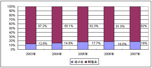 圖2 2003-2007年中國集成電路設計業在產業整體所占份額增長情況