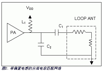 最簡單的匹配網絡是“分離電容”,如最近發表在Microwaves & RF的一篇文章所述。3 連接此電容到具有偏置電感的PA輸出(見圖2),可以調節C2,使其與L1 (與PA電容有關)和殘余電抗(來自C1和環路天線電感)組成并聯諧振。電容器C1的等效串聯電阻(ESR)通常為0.138Ω,所以帶串聯電容的小環形天線總電阻為0.46Ω (在315MHz)。