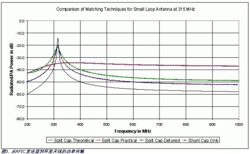 圖3所示是匹配于315MHz時,該匹配網絡的RF功率傳輸特性曲線。功率傳輸特性曲線是由源電阻(RS)將功率傳輸到一個負載阻抗(RL+XL)的表達式計算的,負載阻抗是由匹配網絡變換的環形天線阻抗。