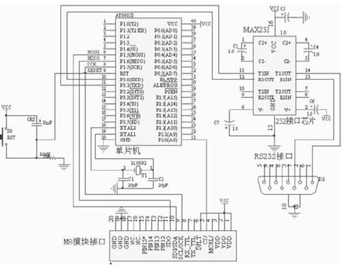 在本設計中控制模塊上需要留有一個接口,一方面與單片機的SPI引腳相連,另一方面通過導線與M8模塊通訊,這樣就實現了控制模塊與M8模塊的通訊。為了將所采集的標簽信息傳輸給上位計算機,可以使控制模塊與計算機之間通過串口通訊。控制模塊的電路原理圖如圖3所示。