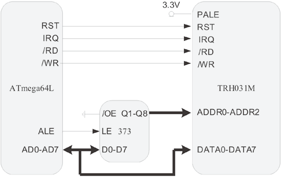 ATmega64L的PTA0~PTA7連接TRH031M的DATA0~DATA7,作為數據/地址線,傳輸數據及地址信息。由于采用數據/地址復用的連接方式,Atmega64L 的PTA0~PTA7通過鎖存器SN74HC373DBLE與TRH031M的地址線引腳A0,Al,A2連接。