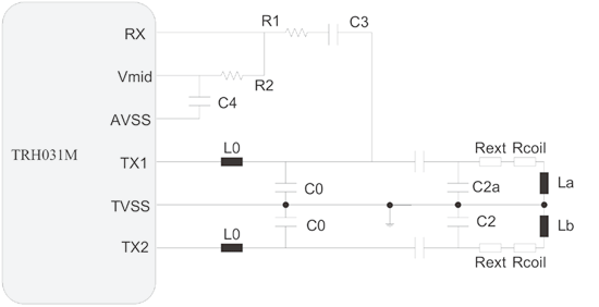 TRH031M的天線部分組成,主要分為發射和接收部分,發射部分又分為EMC低通濾波器,天線匹配部分和天線線圈。天線直接連接到TRH031M.,圖3為天線的結構原理圖。