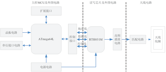 射頻讀寫芯片,負責接收主控MCU的控制信息并完成與RFID卡的通信操作。為了正常工作,射頻讀寫芯片須選用合適的并行接口與MCU連接。而為了發送、接收穩定的高頻信號,射頻讀寫芯片要通過高頻濾波電路與天線部分連接。